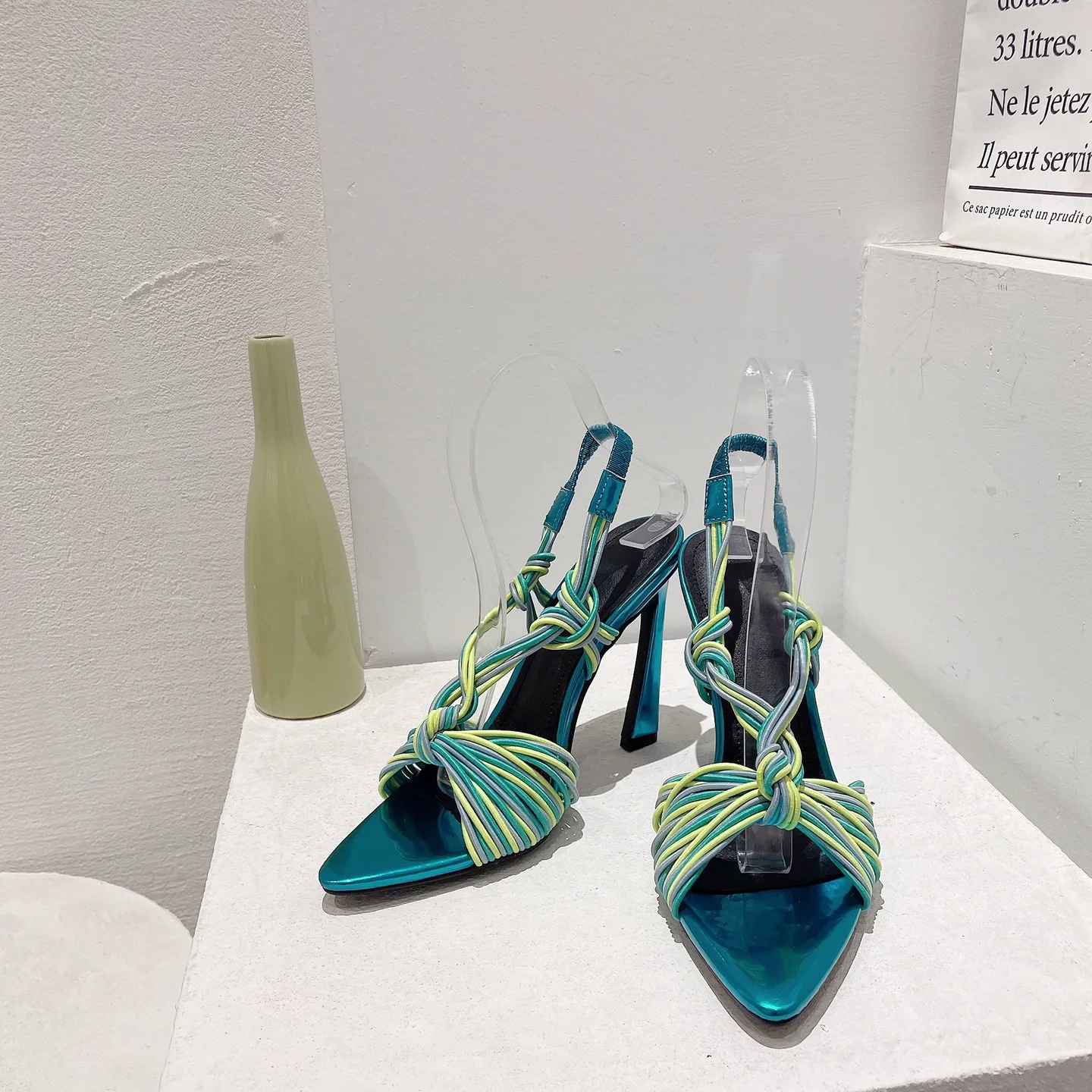 Fashionable Design New Pointed Toe Colorful Elegant Stretch Fabric Branded Special Heel Stiletto Roman Sandals For Women