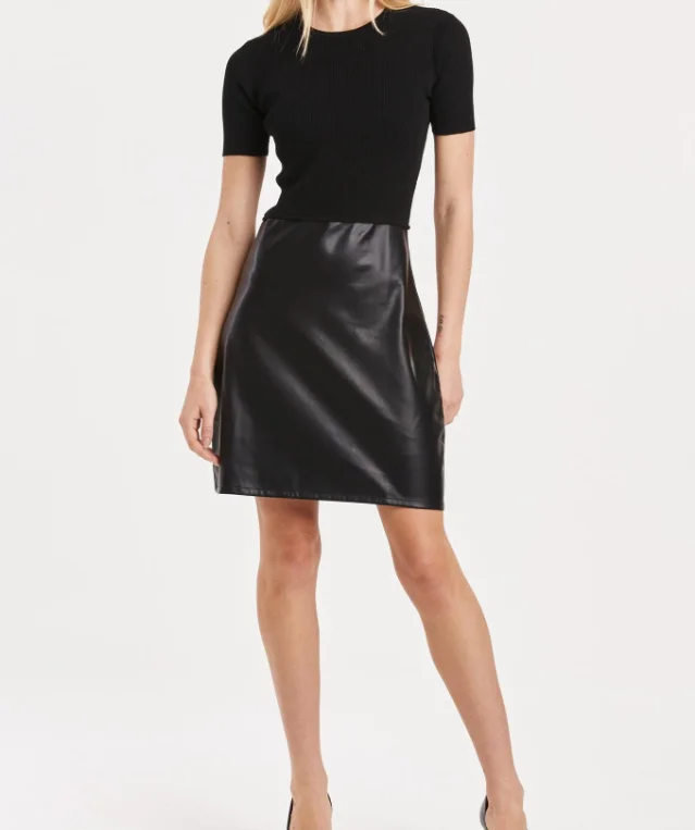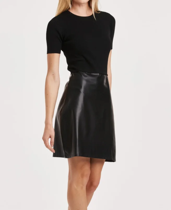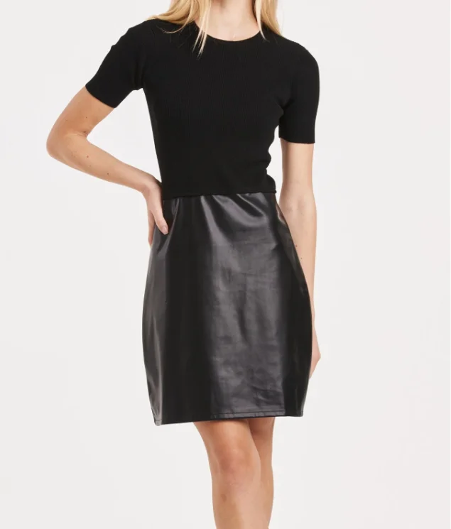 Girls' Daily Commuting Slim Fit Black Sweater Dress With Faux Leather Round Neck And Short Sleeves Midi Length
