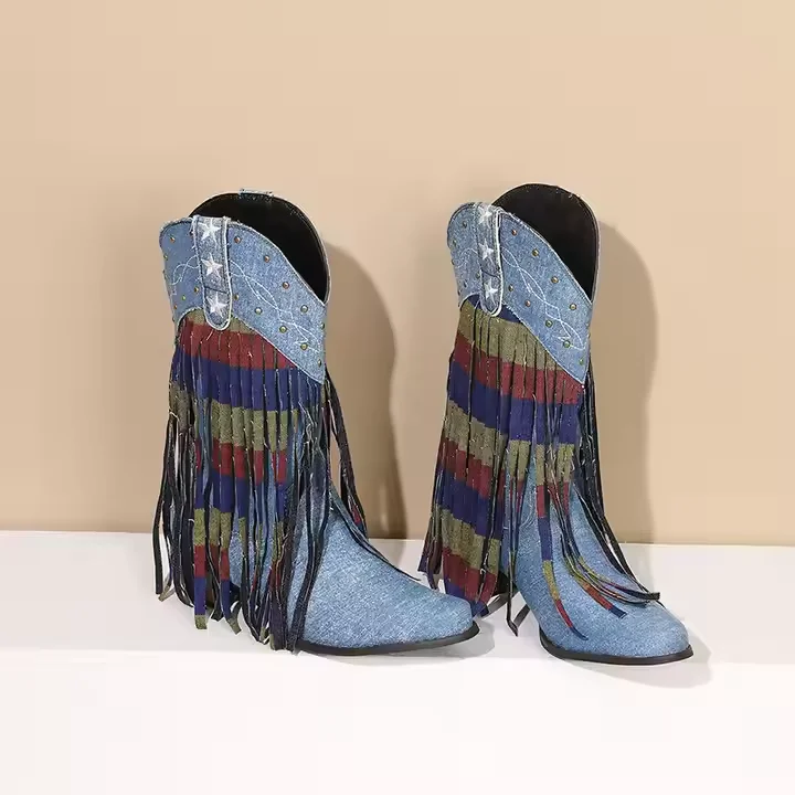 Be the first to review “Ladies Calf Boots Size 34-43 Denim Fringe 5cm Block Heel Women Western Boots”