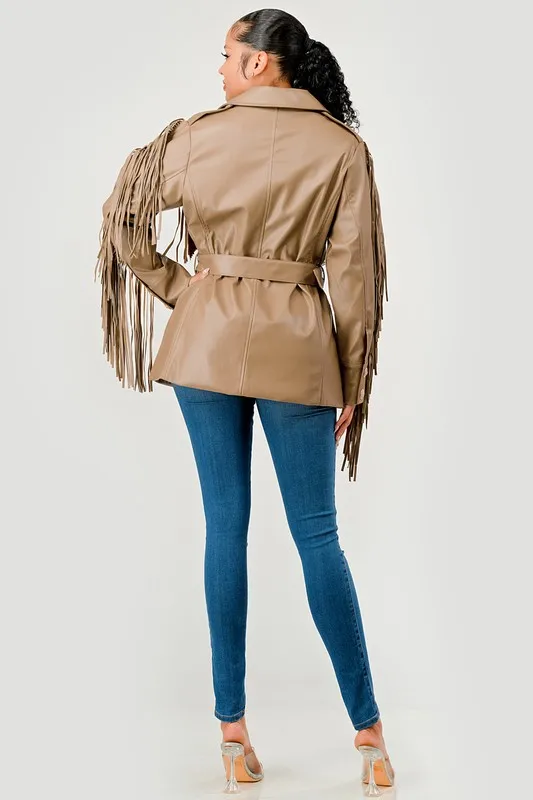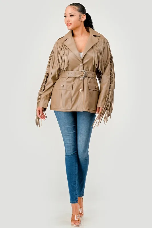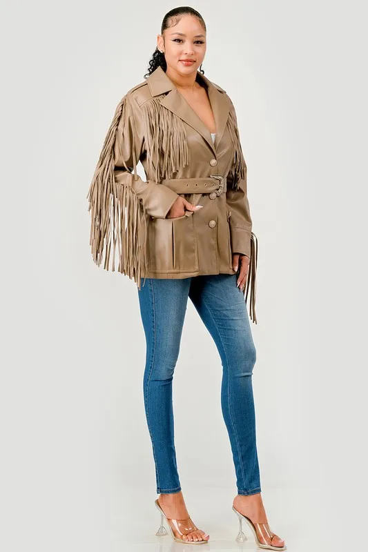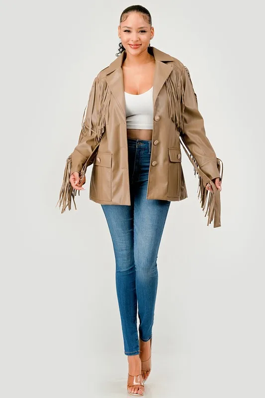 Ladies' Woven Pu Jacket Fringed Tassel Detail Solid Pattern Front Pockets Winter Autumn Season Button Front Closure Included
