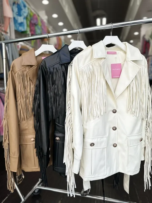 Be the first to review “Ladies' Woven Pu Jacket Fringed Tassel Detail Solid Pattern Front Pockets Winter Autumn Season Button Front Closure Included”