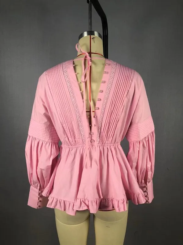Be the first to review “Lady's Pink Puff-sleeved Ruffled Top Lace Trim Pleated Edging V-neck Button Decoration Solid For Casual Outings Winter Spring”