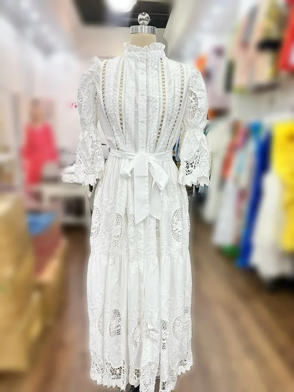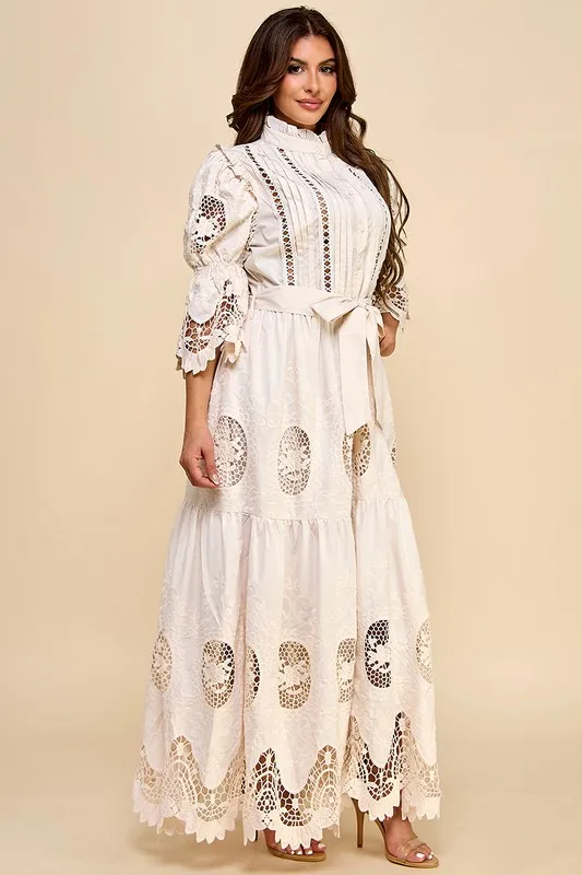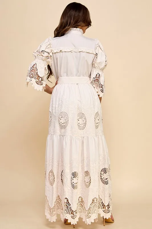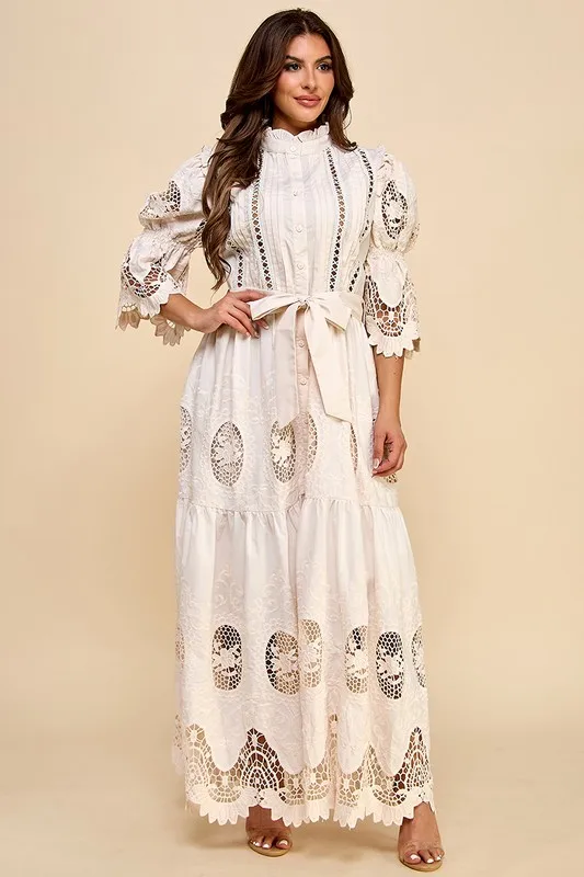 Women's Boho Eyelet Maxi Dress - Tie - Waist, Ideal For Garden Weddings & Folk Festivals