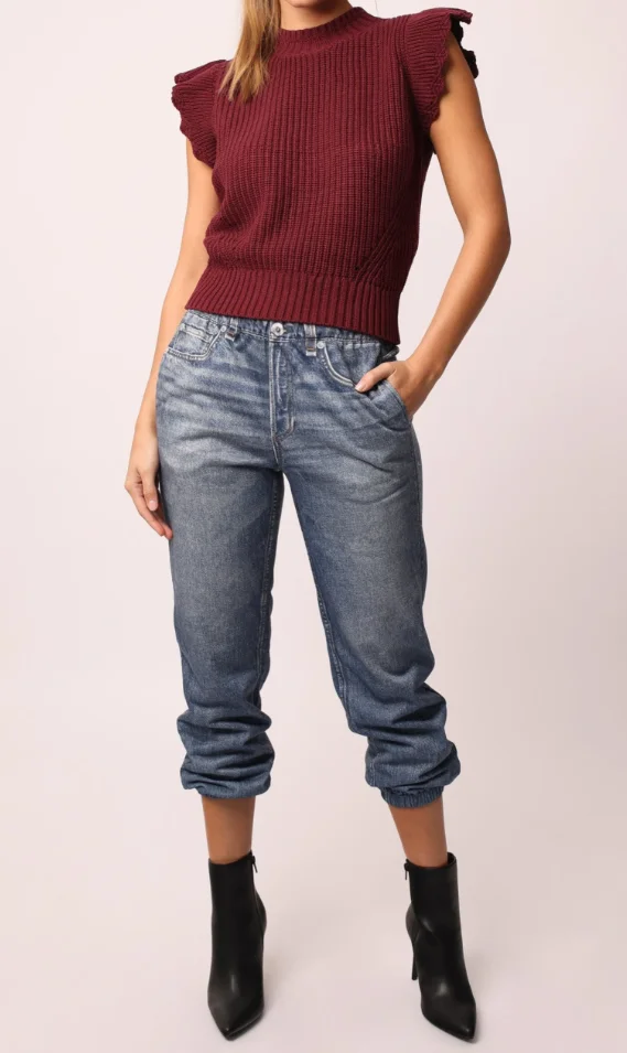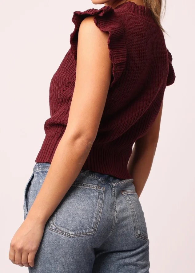 Women's Burgundy Knit Sweater Top With Ruffled Sleeves Semi-high Collar Pattern And For Daily Wear