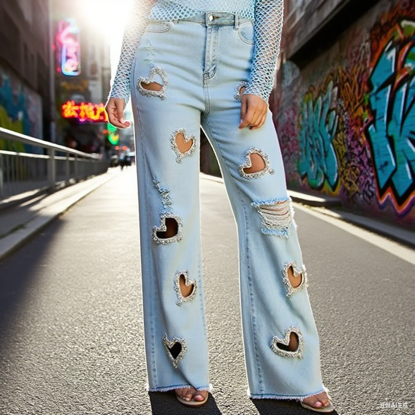 Women's Light-colored Loose-fitting Denim Trousers With Heart-shaped Cutout Wash-up For Summer Music Festivals With Waist