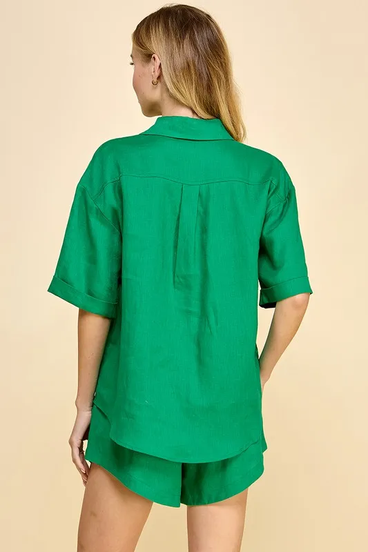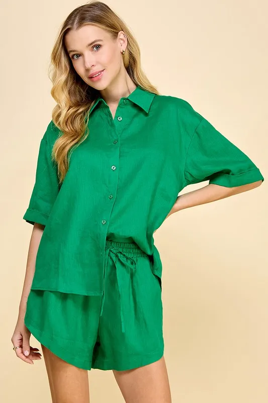 Women's Linen Two - Piece Set - Button - Down Shirt, Drawstring Shorts, Ideal For Casual Outings