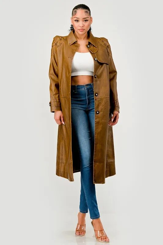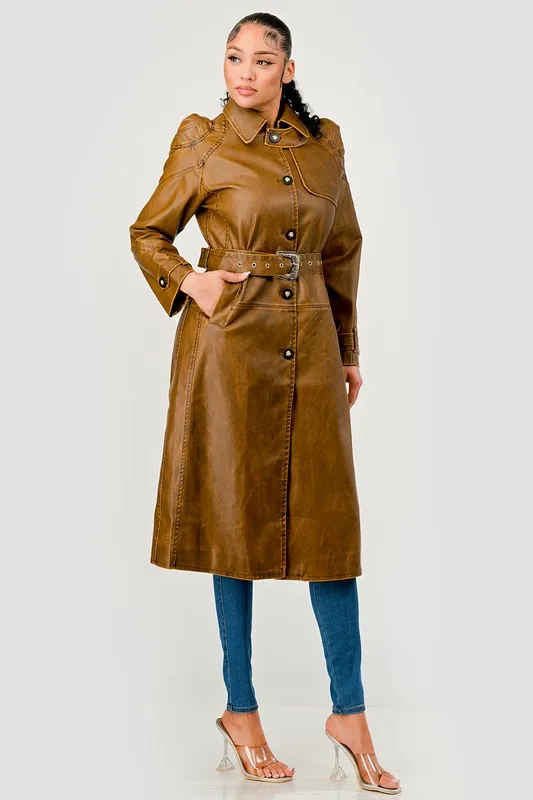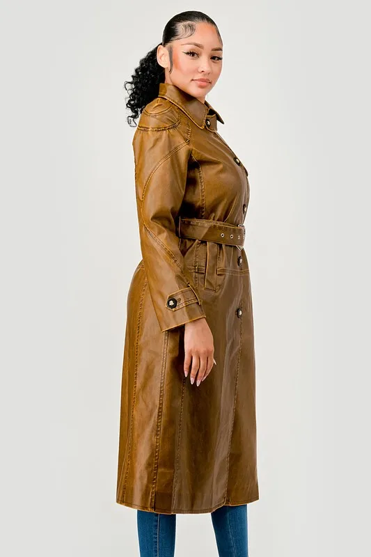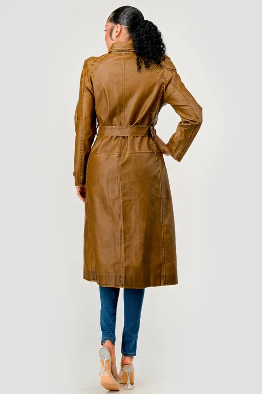 Women's Long Vintage Retro Chic Pu Trench Coat With Belted Waist Structured Shoulders & Polyester Lining