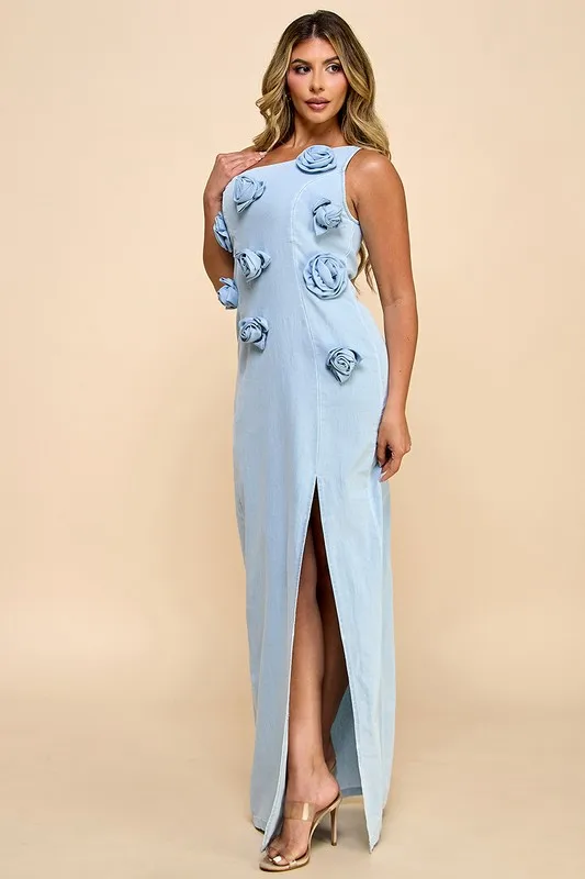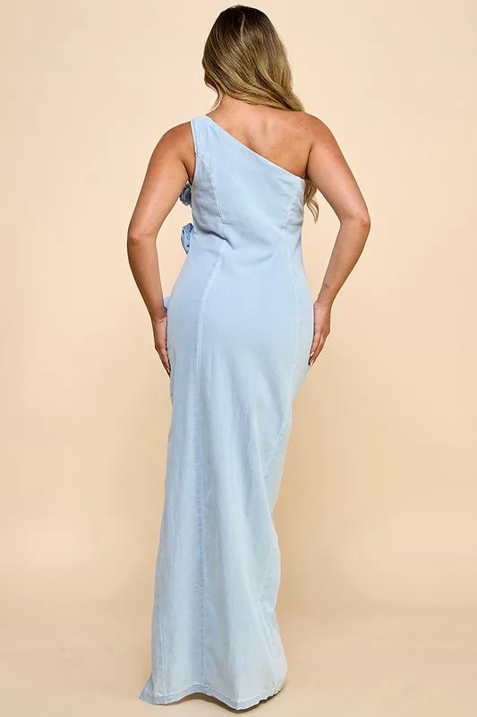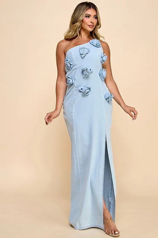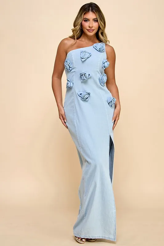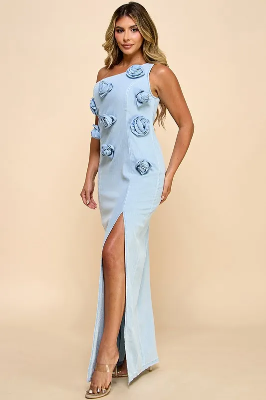 Women's One - Shoulder Denim Dress - Floral Details, Side Slit, Maxi Length, Perfect For Cocktail Parties
