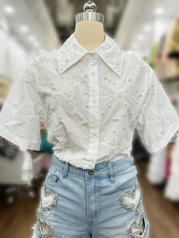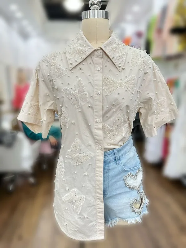 Women's Pearl Shirt With Butterfly Embroidery Front Beading Short-sleeved Cute Style Woven Xl Size For Daily Wear Commuting