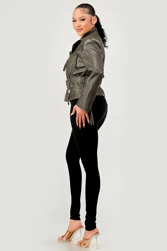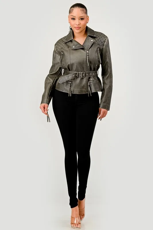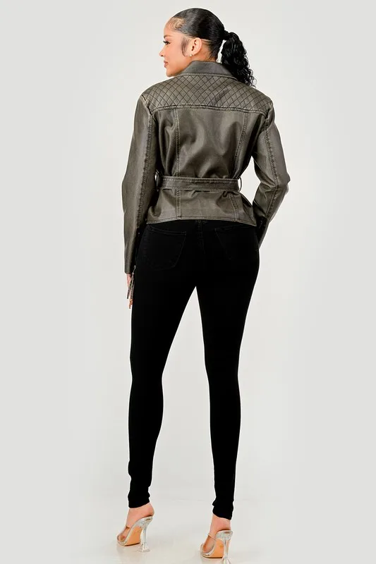 Women's Quilted Pu Moto Jacket With Asymmetrical Front Zip Closure Zip Pocket And Front Waist Belt For Autumn And Winter