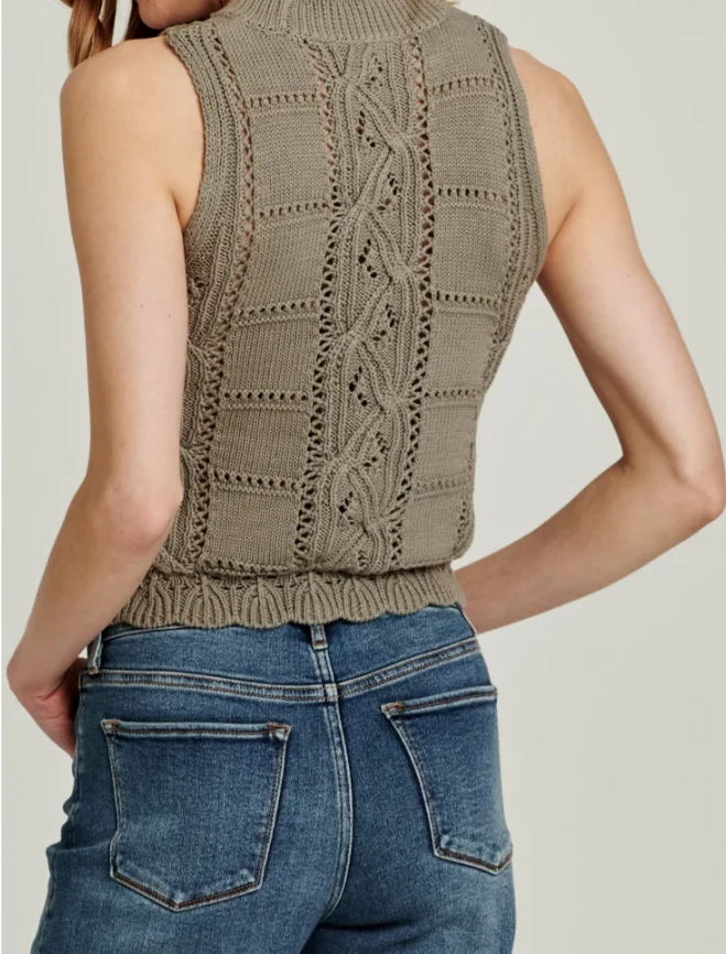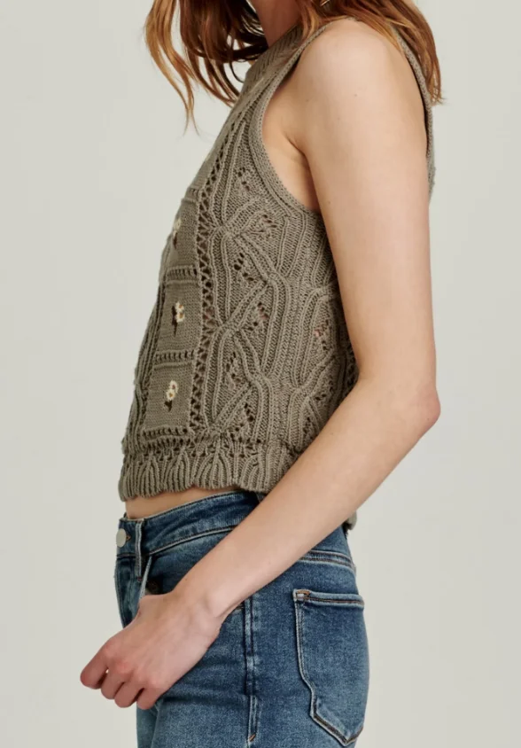 Women's Sage Green Hollow Sweater Crochet Sleeveless Vest-front With Flower Embroidery, Suitable For Leisure
