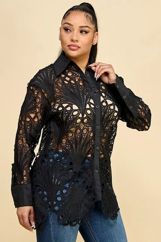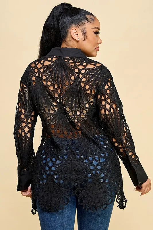 Women's Sexy Lace Long Sleeve Woven Shirt With Button Decor Cutout Details For Spring Music Festivals And Beach Vacations