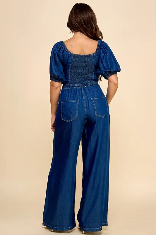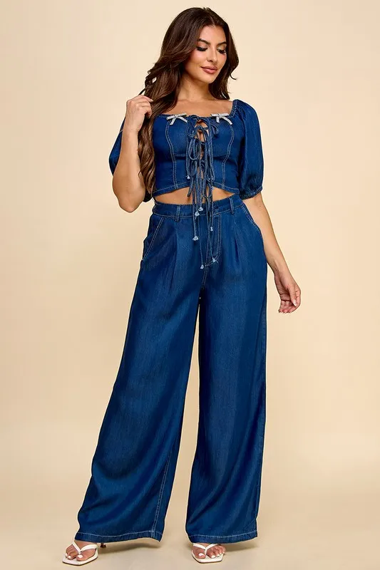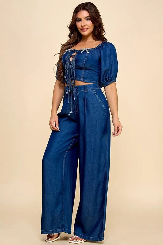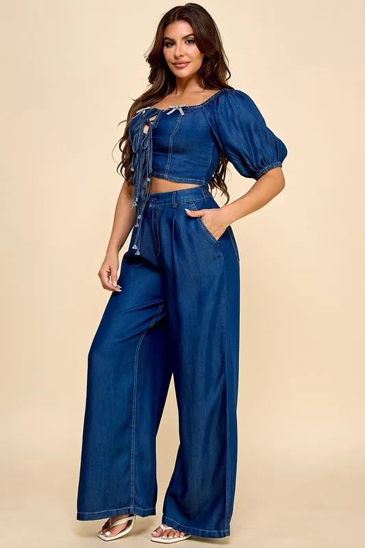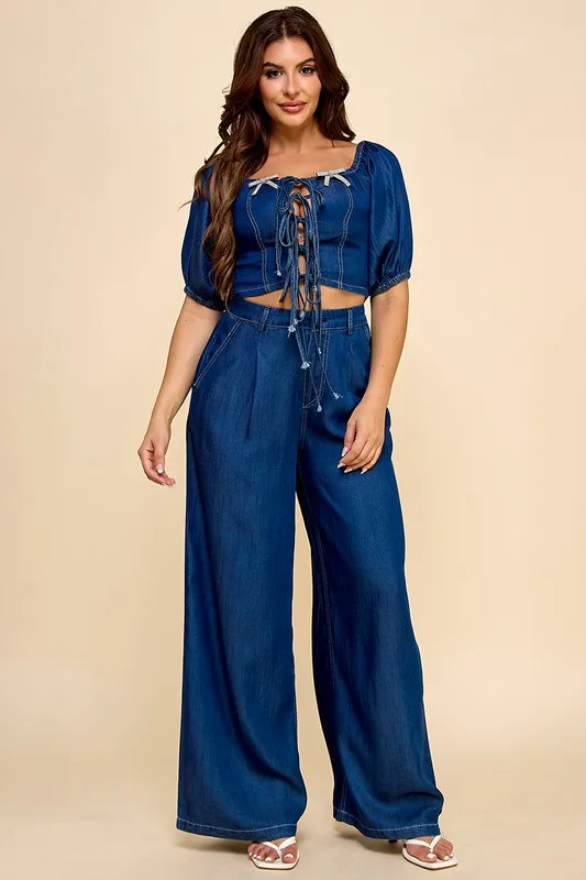Women's Sexy Vintage Denim Two-piece Set Puff Sleeves Lace-up Crop Top And Wide-leg Pants For Summer Beach Vacations