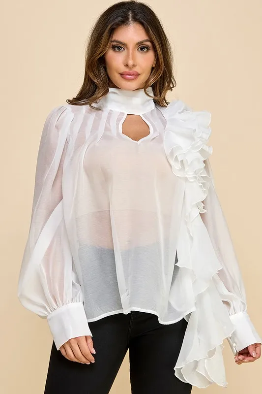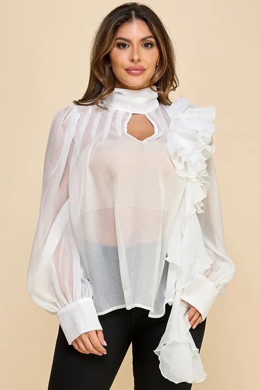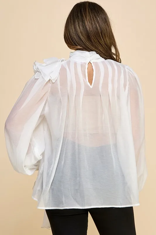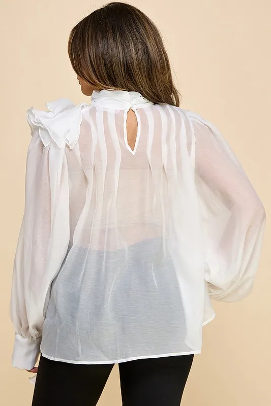 Women's Woven Simple High-neck Transparent Pleated Flower Ruffle Lantern Sleeves Top 100% Polyester
